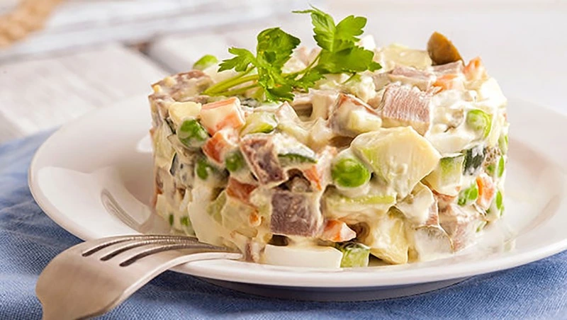 Одно из самых узнаваемых блюд советской кухни — салат оливье. Существует масса рецептов этого блюда. Однако некоторые ингредиенты неизменны: отварной картофель, морковь, зеленый горошек, колбаса, яйца и майонез. На праздниках этот салат — главное блюдо.