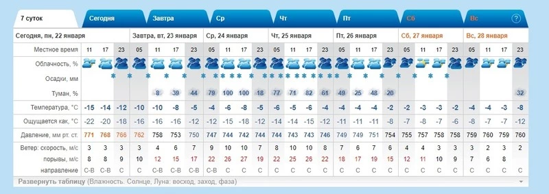 По данным портала «РП5», температура воздуха будет колебаться от -8 до -6 градусов, при этом по ощущениям она достигнет -18 градусов. Отметим, что атмосферное давление резко понизится до 742 мм ртутного столба, хотя еще в воскресенье, 21 января, оно доходило до аномальных значений в 780 мм ртутного столба.