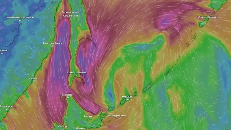 Особенно сильное воздействие нового циклона ощутят жители южной части Сахалина, но осадки ожидаются и в центре острова. По информации, опубликованной на сайте метеосервиса Windy, снег будет сопровождаться метелями, при которых видимость составит менее 500 метров, порывы ветра будут достигать 20-25 м/с.