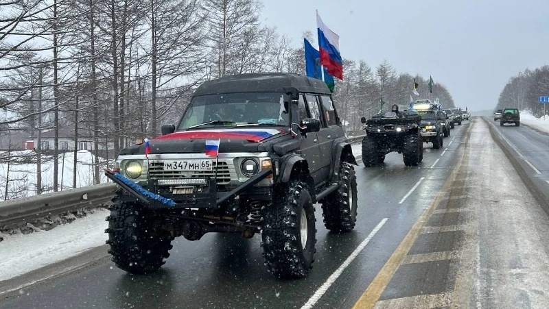 Автомобилисты собрались у ресторана «Генерал», где волонтеры раздали всем флаги и тематические наклейки на машины. Далее в сторону Корсакова отправилась большая колонна во главе Росгвардии, среди которых оказалось множество представителей разных автомобильных сообществ на Сахалине, люди на внедорожниках, легковых автомобилях и даже на квадроциклах — всех сплотило патриотическое мероприятие.
