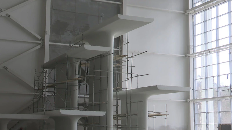 «Выполнены все несущие конструкции, залиты фундаменты, цокольный этаж с монолитной плитой, залито порядка 17 тысяч кубов бетона. Каркас выше нуля, это металлоконструкции, здесь больше 3000 тонн», — рассказал директор компании Дмитрий Сизиков