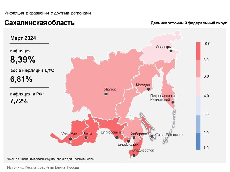 По информации ЦБ РФ, в марте 2024 года инфляция на Дальнем Востоке оставалась на высоком уровне (8,61%), превышая общероссийский показатель (7,72%). Это связано с активным спросом, который позволяет компаниям перекладывать возросшие издержки на потребителей.