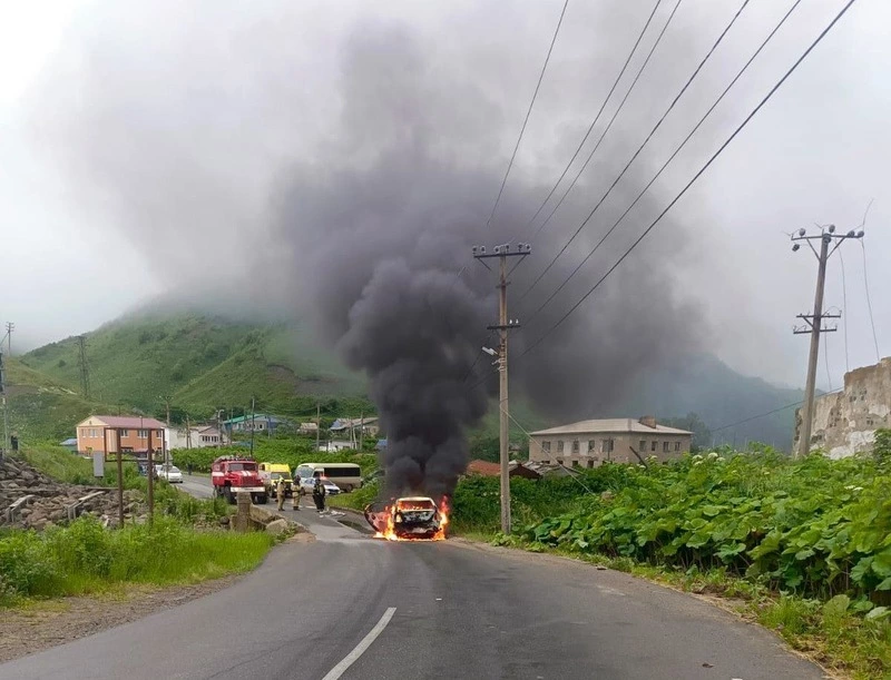 На короткой видеозаписи происшествия видно, что из дымящейся машины вытащили женщину. После этого автомобиль загорелся открытым пламенем.