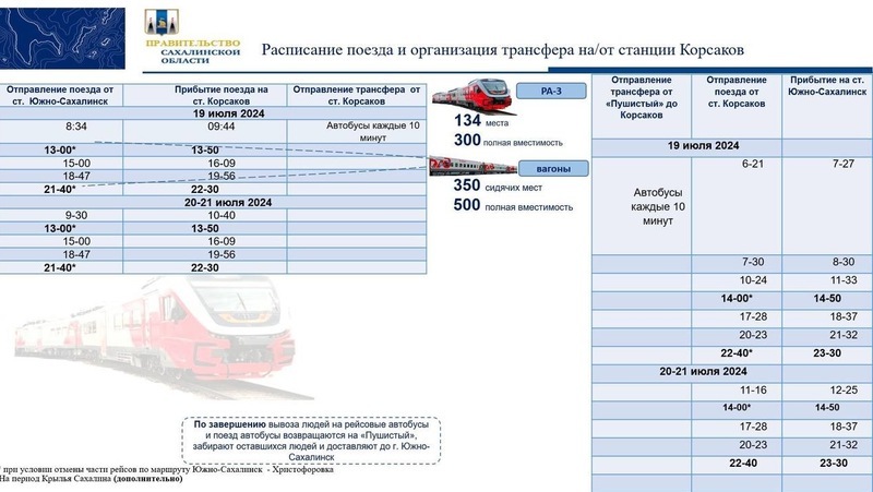 Так, в дни мероприятия из Южно-Сахалинска до Корсакова будет увеличена частота автобусов № 115, а также количество посадочных мест в рельсобусах. По прибытии на автовокзал людей будут ожидать шаттлы, курсирующие по маршруту до аэродрома. Отъезжать от вокзала и с фестиваля они будут каждые десять минут, проезд бесплатный. Расписание движения автобусов от Южно-Сахалинска до Корсакова и обратно находится по ссылке.