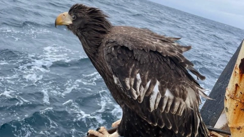 На записи видно, как потрепанный хищник сидит на ограждении на палубе судна. Камера и голос автора, кажется, поначалу смущают хищника, что тот даже отвернулся, но потом он все же поворачивает голову. «Вот, наш земеля! Ну что ты, друг мой? Настоящий дикий орел! Остался у нас, двигается с нами. Смотри какой! Самый гордый», — говорит автор видео.