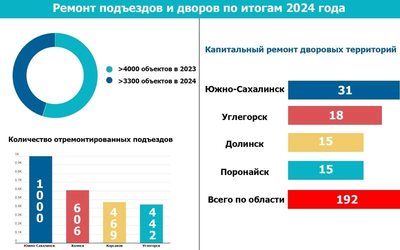 Южно-Сахалинск занял первое место по количеству обновлённых подъездов. В Южно-Сахалинске было отремонтировано тысяча подъездов в этом году, а годом ранее — две тысячи. Второе место занял Холмский район с 627 обновленными подъездами за два года. Также выделяются Корсаковский район с 489 и Углегорский с 418 подъездами. В этом году некоторые муниципальные образования превзошли свои планы: в Томаринском отремонтировали 140 подъездов вместо 55, в Анивском — 228 вместо 120, а в Тымовском — 127 вместо 88.
