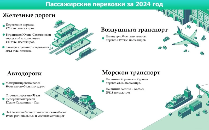 За 2024 год жители Сахалина и Курил совершили более 47 миллионов поездок на общественном транспорте. Появились новые межмуниципальные маршруты, в том числе № 113 «Южно-Сахалинск — Анива пляж — Южно-Сахалинск» (сезонный) и № 118 «Южно-Сахалинск — ж/к „Зеленая планета“ — Южно-Сахалинск», а также «Южно-Сахалинск — Чехов — Южно-Сахалинск». В летний период были введены дополнительные рейсы по маршруту № 530 «Оха-Ноглики-Оха». В планах на 2025 год — запуск сезонного маршрута от г. Южно-Сахалинск до пляжа «Охота» в с. Охотское Корсаковского района. Воздушный транспорт перевез 119 тысяч пассажиров, морской — более 57 тысяч, а железнодорожный — более 722 тысяч пассажиров.