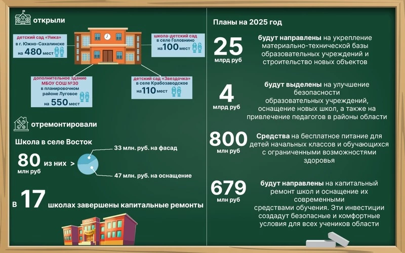 В День знаний 2024 года открыли дополнительное здание школы №30 в планировочном районе Луговое, способное вместить 550 учащихся и обустроенное зонами рекреации. На Курилах в селе Крабозаводское достроили детский сад на 110 мест, а в селе Головнино — школу-детсад, рассчитанную суммарно на 100 детей, на ее территории есть футбольное поле, площадки для волейбола и баскетбола, зона для воркаута.