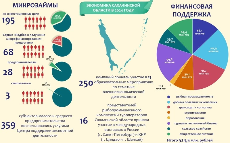 Также в 2024 году в минэкономразвития области объем финансовой поддержки составил 524,5 миллиона рублей. 66,1 млн рублей получили представители рыбной промышленности, добытчики полезных ископаемых — 101,9 млн рублей, транспорт и логистика — 91,2 млн рублей, строительство — 50,1 млн рублей, образование — 11,3 млн рублей, туризм и гостиничный бизнес — 99,8 млн рублей, сельское хозяйство — 39,7 млн рублей, общественное питание — 64,4 млн рублей.