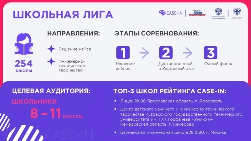 Одним из направлений проекта является «Школьная лига» (далее – Школьная лига) – соревнование среди школьников по решению кейсов и разработке проектов инженерно-технической направленности, ориентированное на популяризацию знаний о деятельности современных промышленных предприятий, оборудовании, инновационных, цифровых технологиях для осознанного выбора профессии, в том числе выбора будущего места обучения и поступления в ведущие университеты страны.