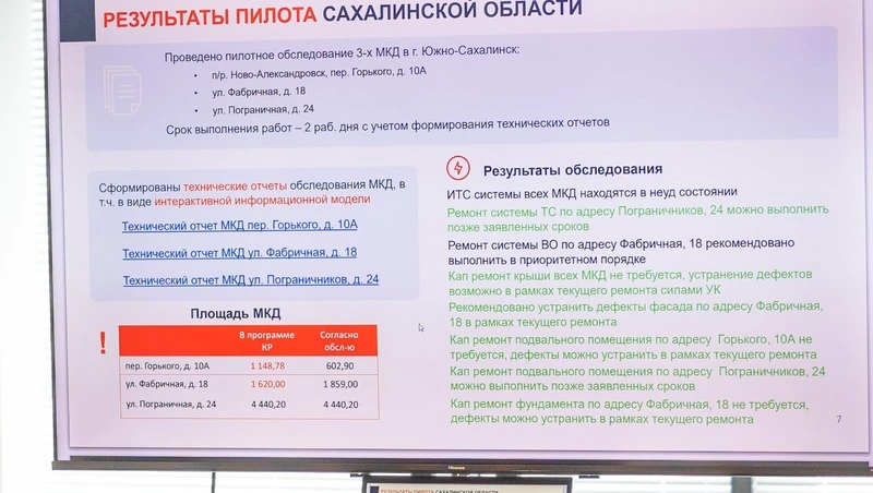 «Оказалось, что зачастую достаточно текущего ремонта для того, чтобы содержать дом в порядке, только проводить его нужно своевременно. Например, выяснилось, что ремонт 11% обследованных конструкций надо было выполнить ранее, чем это планировалось по программе капитального ремонта. А 7,5% конструктивных элементов вообще не входили в программу капитального ремонта, хотя это было необходимо. Такие показатели были в Нижнем Новгороде. В прошлом году мы сделали маленький «пилот» на Сахалине, обследовав 3 дома буквально за 2 дня, включая создание отчёта. В процентном соотношении состояние конструктивных элементов распределилось приблизительно также, как и в Нижегородской области, — рассказала Анастасия Димитрова.