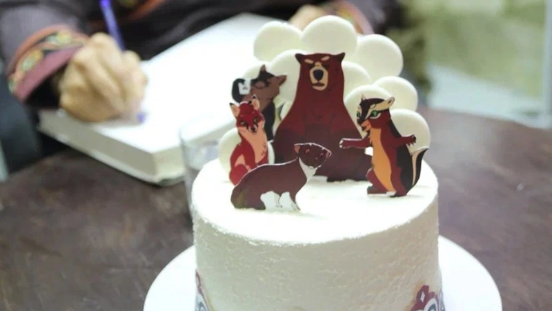 От имени музея книги Чехова Владимиру Санги вручили цветы и необычный подарок — торт, украшенный фигурками героев сказки «Бурундук ищет друга».
