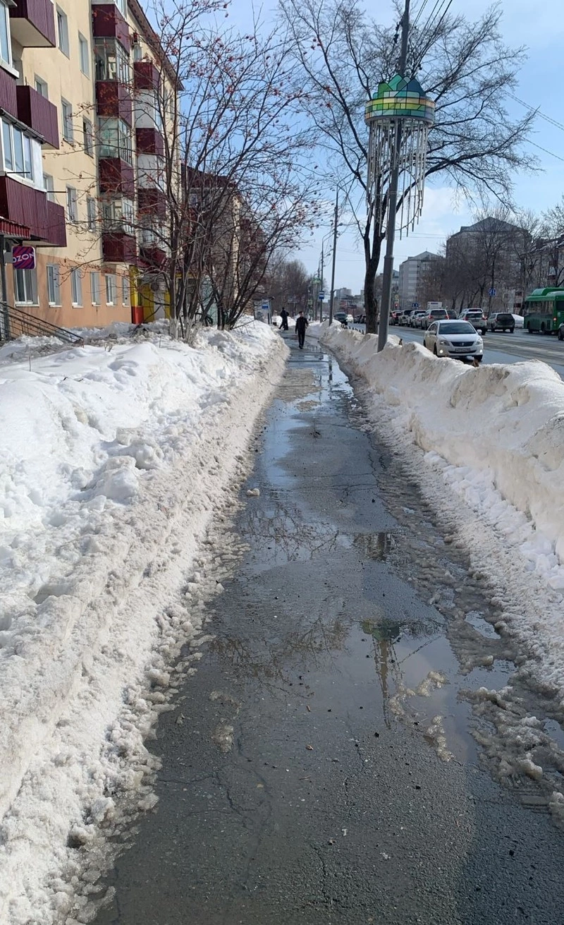 Вторая жалоба поступила от жительницы района «Луч», речь идет о доме № 159 по улице Комсомольской. Сахалинка сообщила об огромной луже, образовавшейся на тротуаре из-за таяния неубранного снега.
