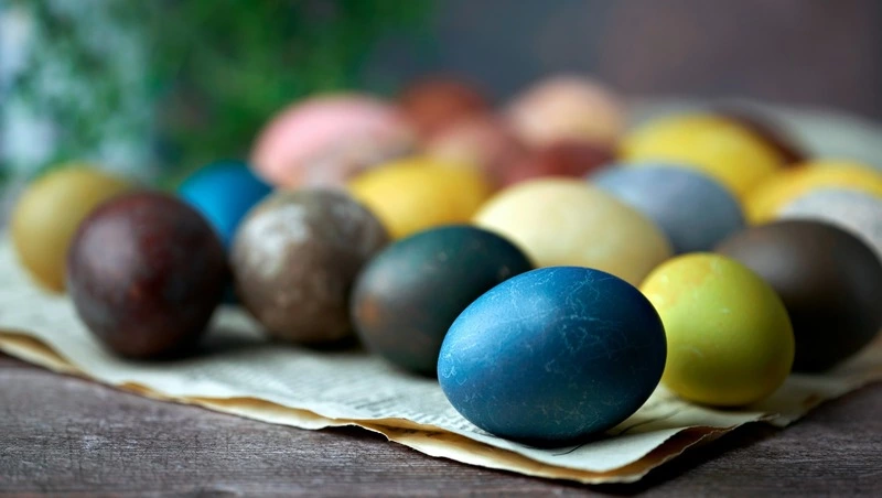 Черника окрашивает скорлупу в загадочные оттенки — от мягкого серо-голубого до насыщенного фиолетового. Чем дольше держите в отваре, тем глубже цвет.
