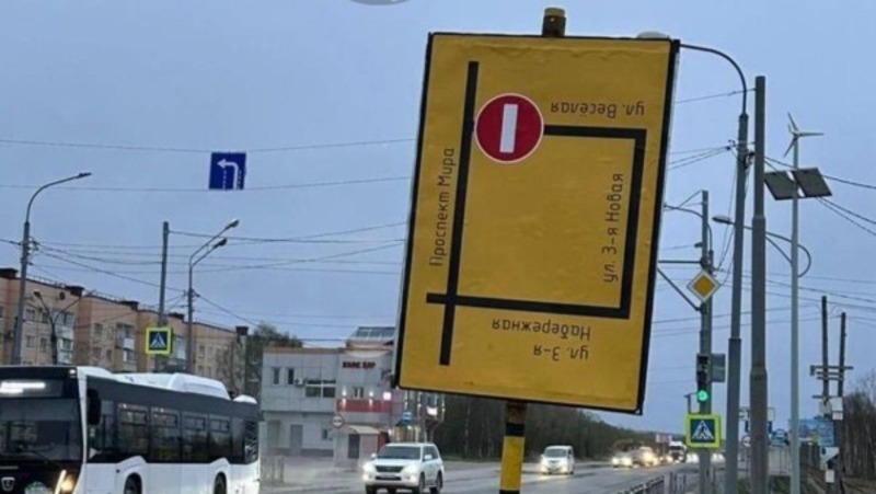 На проспекте Мира в Южно-Сахалинске установили новый дорожный знак, запрещающий проезд на улицу Веселую. Однако бдительные горожане заметили, что знак поставили вверх тормашками.