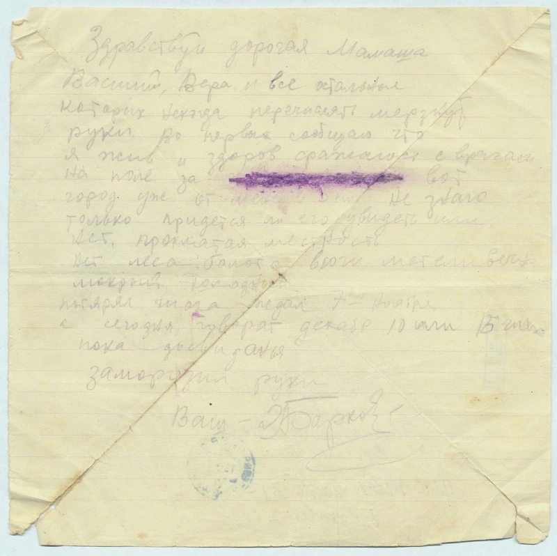 «Добрый день, дорогие родители, Мама, Вася, Костя, Оля, Ира, Вова, Муся, Ляля, сестра Вера (далее текст не читается, предположительно, затёрто военной цензурой — прим. автора), ну и остальные друзья и знакомые, перечислять некогда — пишу на поле боя: свистят пули, рвутся снаряды, я ещё жив и здоров, но уже крещён снарядом, благодаря глубокому окопу меня только оглушило. Я три дня плохо слышал, и присыпало землёй, а в остальном всё в порядке, участвовал уже в двух атаках, конечно, немцы боятся русского штыка и крика «ура», бросают всё и отступают.