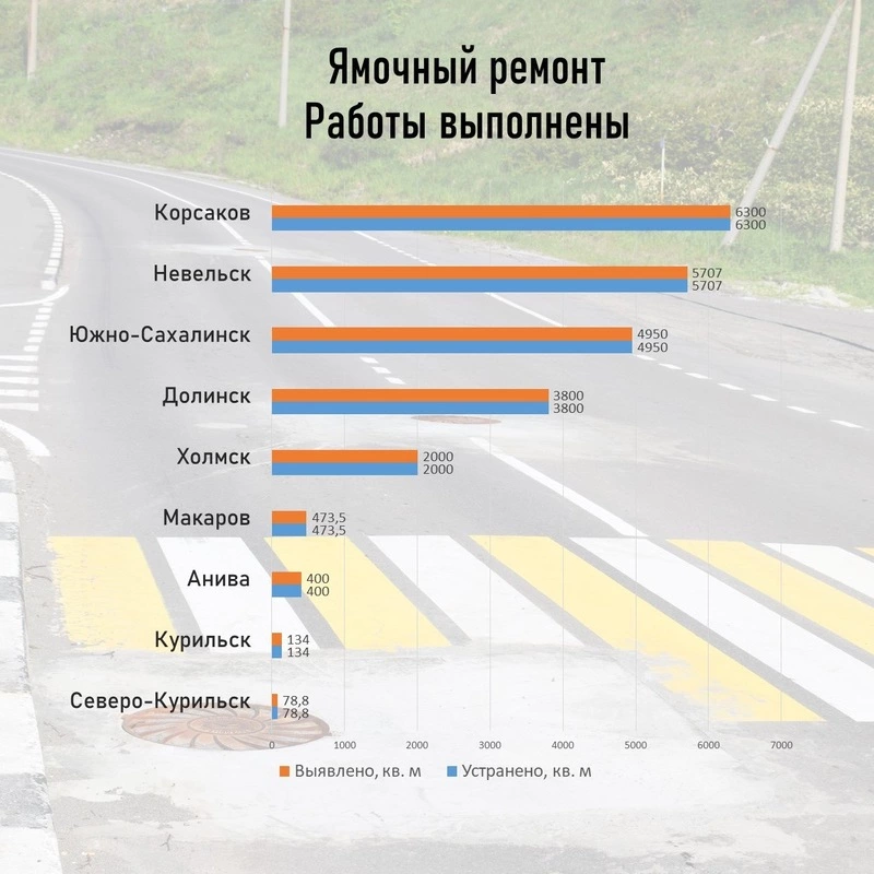 По поручению губернатора Валерия Лимаренко ямочный ремонт на юге Сахалине завершили до 1 июня, в остальных муниципалитетах срок окончания работ — до 1 июля.
