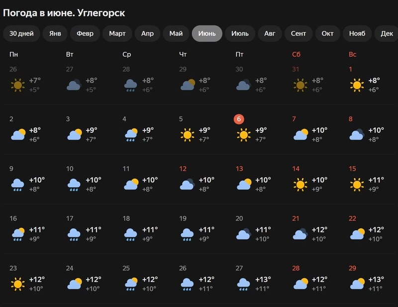 Свежо и хмуро будет в Углегорском муниципальном округе. По предварительным данным, осадки пройдут 9 и 10 июня, а также 17-19 и 25–27 июня. Максимальная дневная температура — +13 градусов.