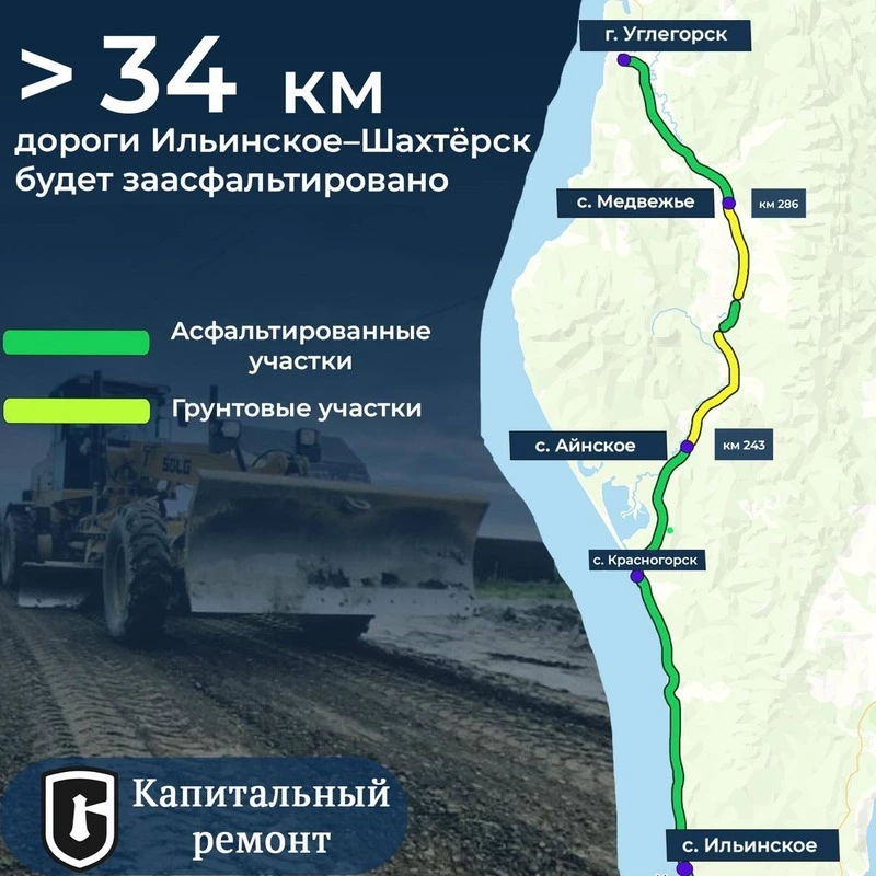 Реконструкция дороги от Ильинского до аэропорта Шахтерск разделена на три этапа. В рамках второго этапа до конца 2026 года планируют убрать более 20 км грунтовых разрывов между селами Парусное, Красногорск, Айнское и севернее Углегорска. Полное асфальтирование участка от Ильинского до Шахтерска намечено на 2028 год.