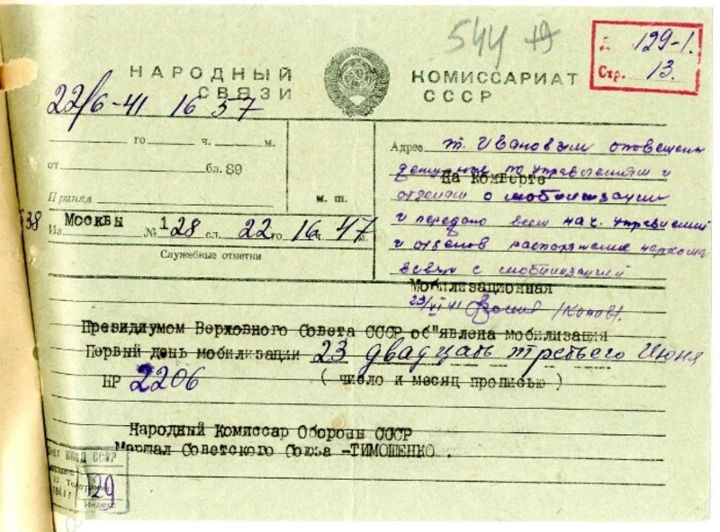 Вслед за правительственным сообщением был передан Указ Президиума Верховного Совета СССР о мобилизации военнообязанных граждан 1905–1918 гг. рождения. 23 июня была создана Ставка Главного Командования Вооруженных Сил СССР (позднее Ставка Верховного Главнокомандования) во главе с народным комиссаром обороны, Маршалом Советского Союза С. К. Тимошенко.