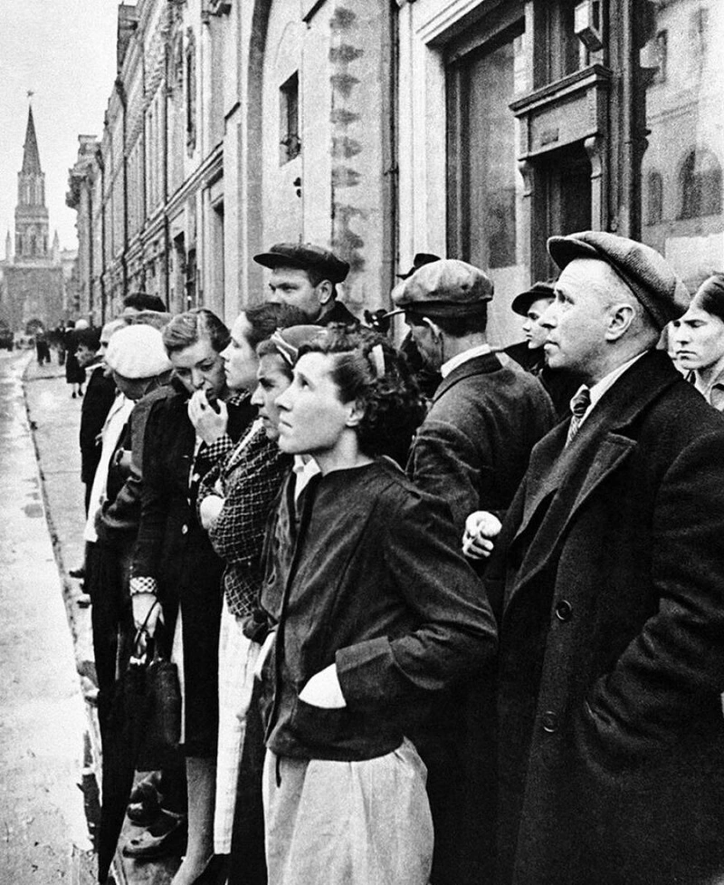 В военкоматы выстроились длинные очереди добровольцев. По примерным оценкам, только в первые часы после сообщения о войне их насчитывалось десятки тысяч. Узнав, что нацисты напали на СССР, люди всюду пропускали военных: в магазинах, столовых и других общественных местах им уступали места. По распоряжению московских властей на киносеансах 22 июня перед показом художественных фильмов на экраны выводили обучающие записи: «Простейшие укрытия от авиабомб» и «Светомаскировка жилого дома». Жители центральной части Советского Союза замерли в ожидании вестей.
