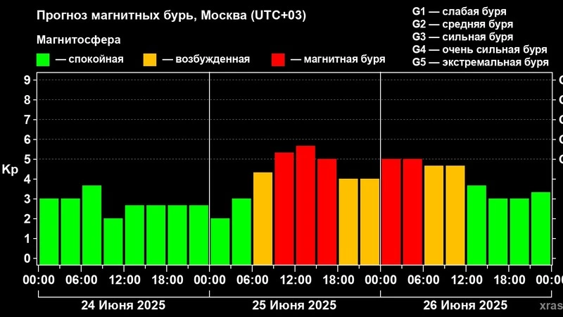 Пик геомагнитных бурь ожидается 26 июня днем. Основной сценарий — бури среднего уровня (G2). Вероятность более сильных бурь (G3 и выше) составляет около 15%. Также есть шанс (20%), что возмущения будут незначительными и останутся в пределах желтого уровня.
