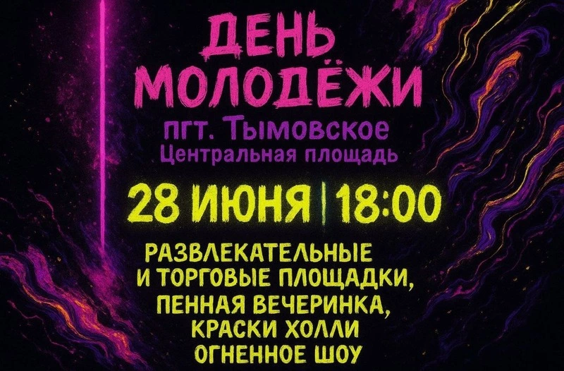В Тымовском районе День молодежи отметят вечером 28 июня на Центральной площади поселка Тымовское. С 18:00 гостей ждет веселая музыка, интерактивные развлечения и традиционные краски Холи. Для желающих подкрепиться развернутся торговые ряды с горячими закусками и напитками. Финал праздника — зажигательная пенная вечеринка, которая соберет молодежь и семьи на центральной площадке и подарит массу позитивных эмоций.