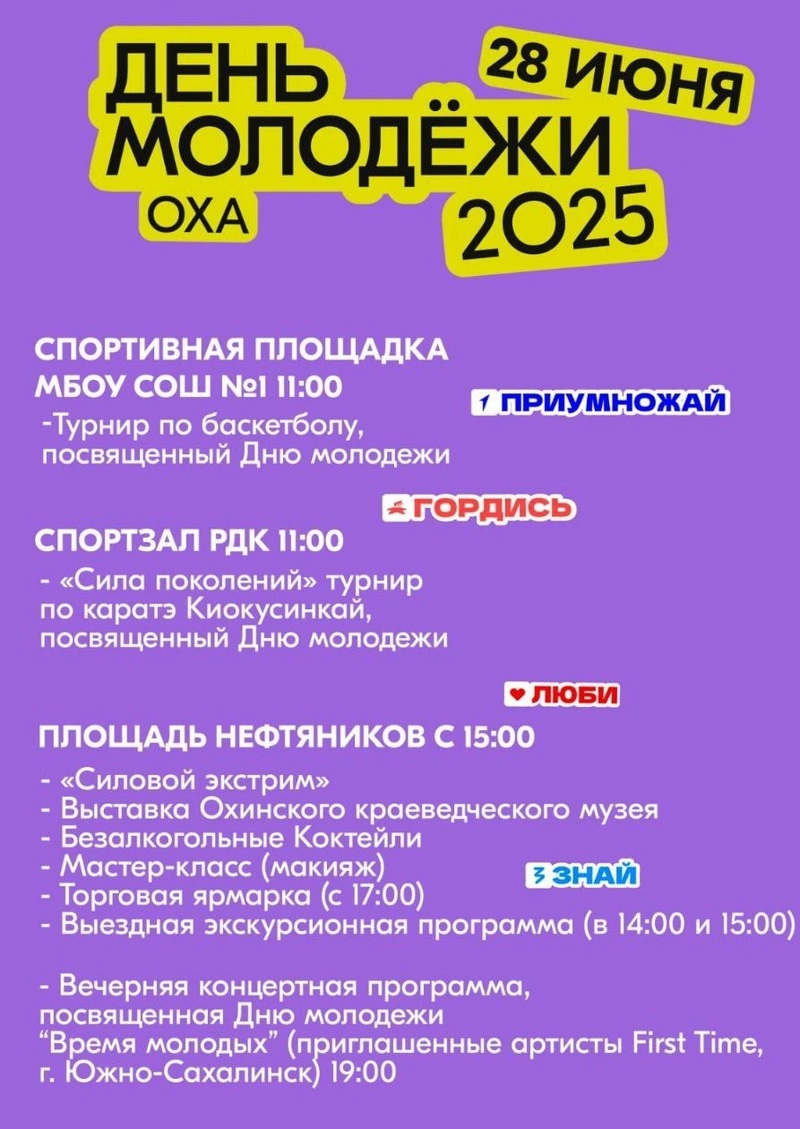 В Охе День молодежи развернется сразу на нескольких площадках. С утра пройдут спортивные турниры: баскетбол и каратэ Киокусинкай. С 15:00 центральная площадь Нефтяников станет местом массового праздника: здесь ждут силовой экстрим, выставку краеведческого музея, мастер-классы по макияжу, торговую ярмарку и выездные экскурсии. Вечером площадь соберет всех на концертную программу «Время молодых» с приглашёнными исполнителями из Южно-Сахалинска. Завершит вечер группа First Time.