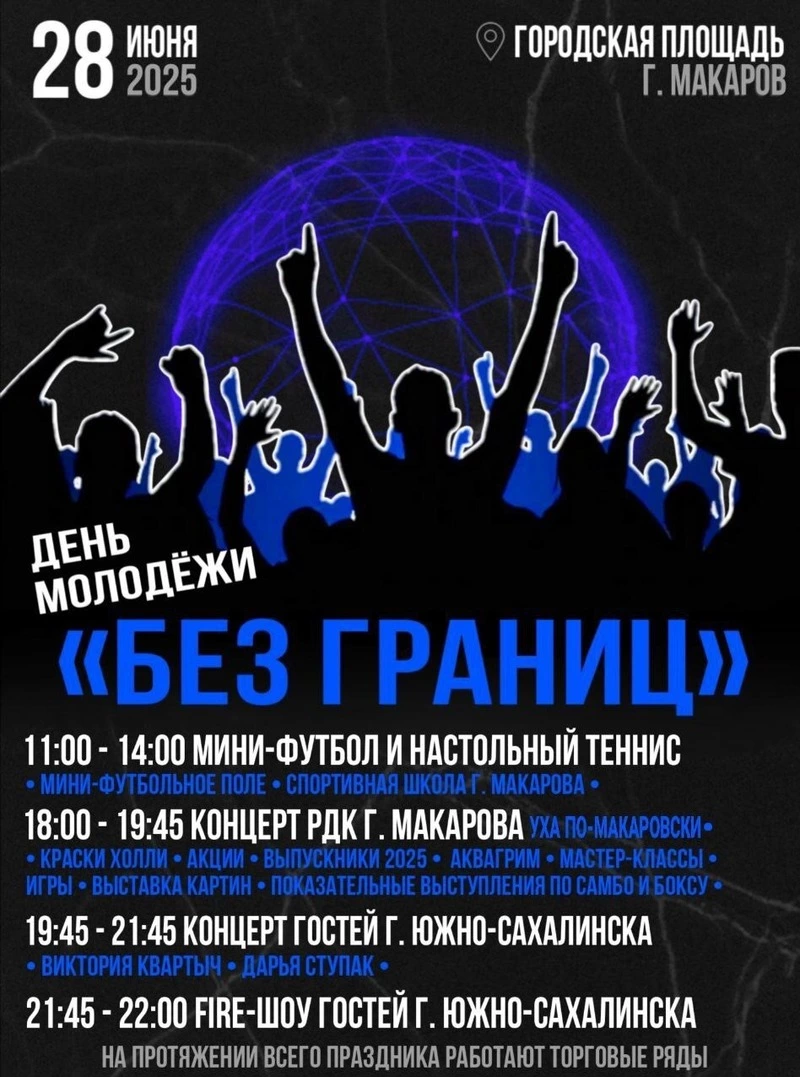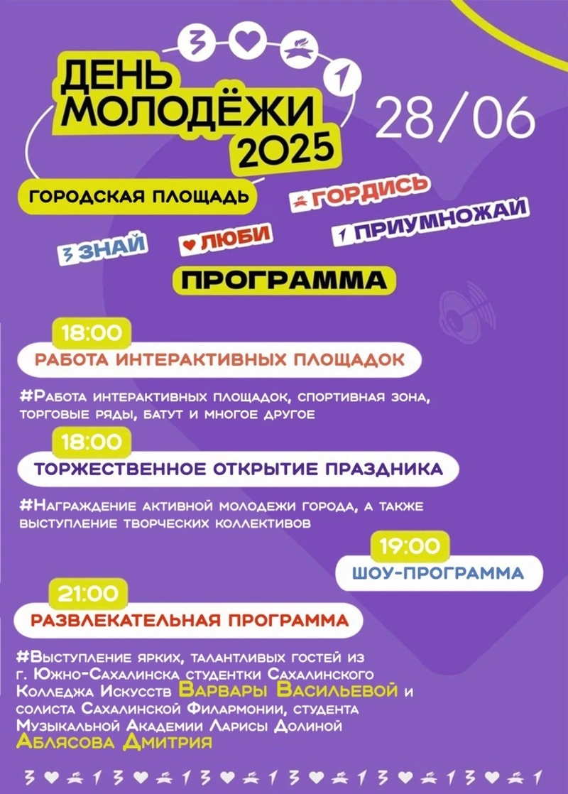 В Александровск-Сахалинском округе День молодежи — это заряд творческого драйва и эмоций. Праздник начнется 28 июня в 18:00 с работы интерактивных площадок и чествования лучших представителей молодого поколения округа. С 19:00 — большая шоу-программа с конкурсами, музыкой и номерами местных артистов. Вечером атмосферу создадут гости из Южно-Сахалинска — Варвара Васильева и Дмитрий Аблясов. Они привезут в Александровск-Сахалинский яркие номера и искренний музыкальный настрой.