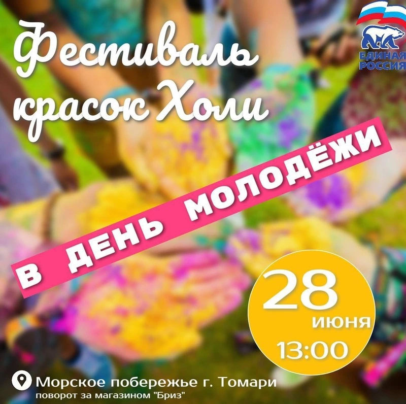 Фестиваль красок Холи в Томари станет главным акцентом празднования. 28 июня с 13:00 на побережье (за магазином «Бриз») гостей ждут музыка, торговые точки с лимонадом и попкорном, краски Холи — все для веселого и яркого праздника.
