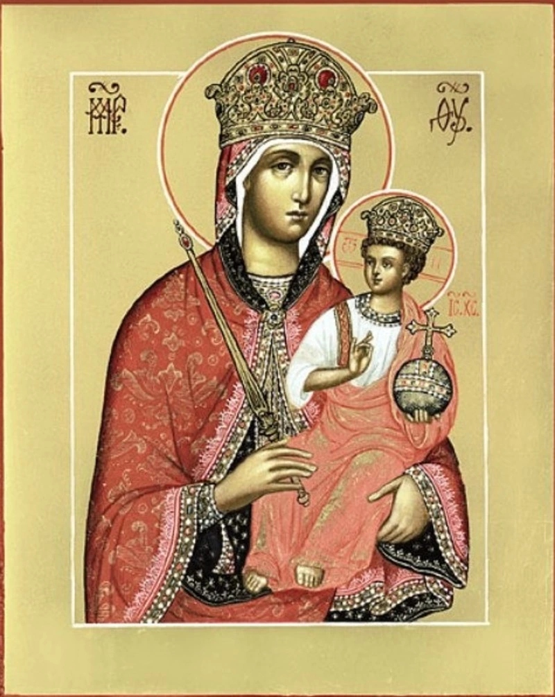Божью Матерь изобразили по типу «Одигитрии» — святая нарисована по пояс, на одной руке она держит Младенца. Вторая рука поднята. Воинственный образ иконе придают царкие регалии: скипетр, держава, венцы.