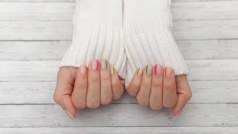 Если хочется отдыха от цвета, но скучно носить просто бежевый или молочный — добавьте тонкий цветной акцент. Например, яркую линию у кутикулы, цветной френч или маленький стикер. Сейчас особенно актуальны акценты в оранжевом, зеленом и сиреневом — оттенках летних аксессуаров.