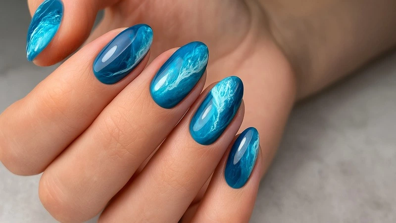 Если вы пропускаете отпуск, но скучаете по морю, возьмите его с собой — хотя бы на ногтях. Сине-зеленая палитра с прозрачными переливами имитирует глубину воды. Иногда добавляют мраморные разводы или тонкую белую паутинку — получается имитация морской волны. Такой дизайн освежает руки и делает образ чуть более смелым. Идеально сочетается с загаром.