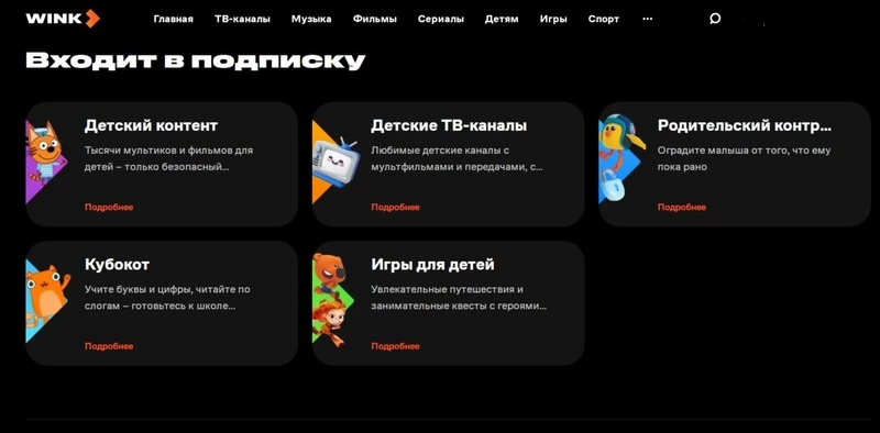 Для детей есть специальная подписка «Wink Дети», которая включает 23 детских телеканала, более 8 тысяч фильмов, сериалов и мультфильмов, приложение для подготовки детей к школе «Кубокот», а также развивающие игры и обучающий контент.