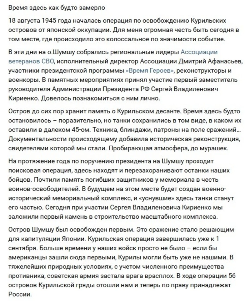 Статья под абсурдным заголовком «В Японии прошли памятные мероприятия к юбилею освобождению Курильских островов» на самом деле является пересказом поста участника проекта «Школа героев» Дениса Михайлина. В своем тексте он с гордостью описывает визит на российский остров Шумшу, где в эти дни проводят мероприятия, посвященные Курильской десантной операции.