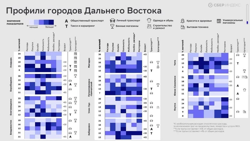 «В большинстве городов Дальнего Востока мы выявили консервативный экономический тип жителей с невысокими расходами, которые ориентированы на локальное потребление. Они совершают покупки в одних и тех же магазинах, большая часть их расходов — обязательные траты на продовольствие, услуги ЖКХ и лекарства. В эту категорию входит 34% населения Анадыря, 17% жителей Хабаровска, 14% Благовещенска, 15% Якутска, 12% Улан-Удэ, 11% Владивостока и Южно-Сахалинска. Низкая мобильность повышает привлекательность онлайн-каналов, однако низкая покупательная способность сдерживает покупателей в офлайне», — прокомментировала Дарья Цыплакова, управляющий директор, руководитель лаборатории СберИндекс.