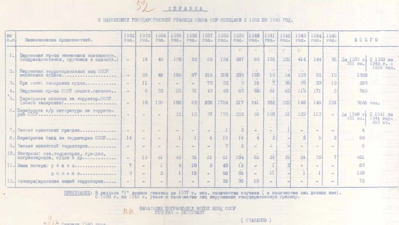 Воздушное пространство СССР было нарушено японскими самолетами 789 раз, а территориальные воды — 1350 раз. За период с 1933 по 1945 год советские пограничники зафиксировали переброску 3666 японских шпионов и 68 диверсионных банд. Японские военные 551 раз открывали огонь по советской территории, обстреливая мирных граждан, пограничные наряды и суда. В результате этих преступных действий были убиты 83 и ранены 120 советских граждан.