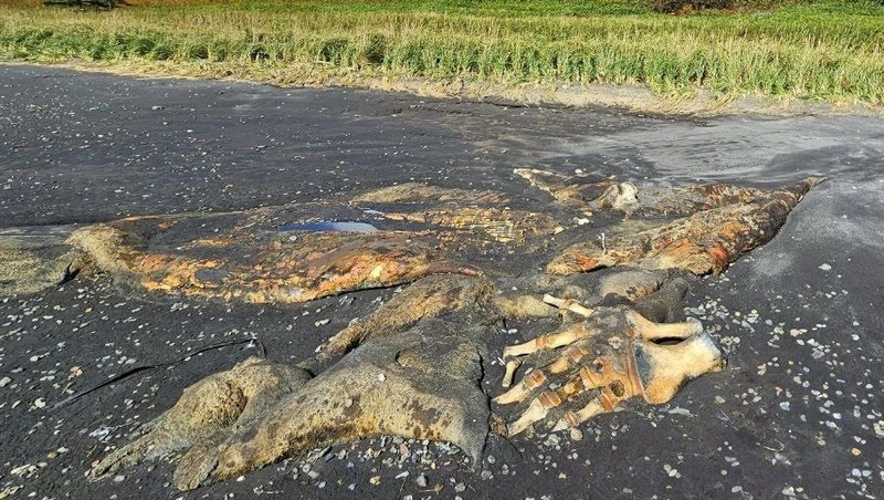 Напомним, неизвестного обитателя морских глубин выбросило в районе термального источника «Чайка». Сначала это была мягкая масса, которую в очередной шторм замыло в песок, а на свет явилась часть скелета. Островной гид Оксана Ризнич отмечала, что, возможно, это кости плавника.