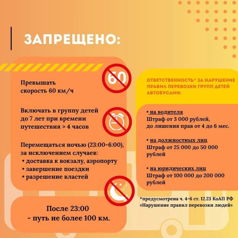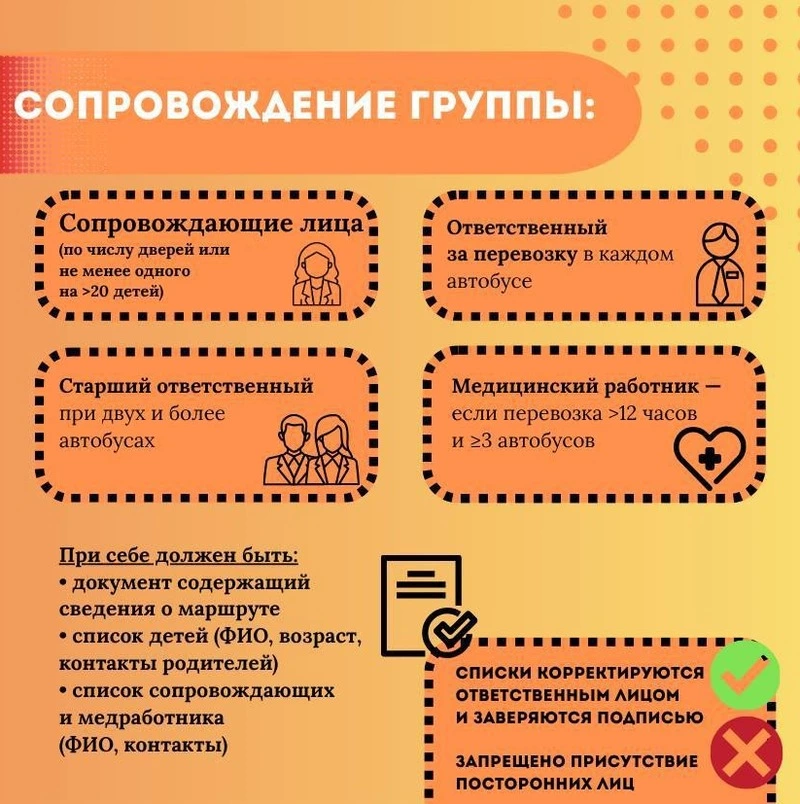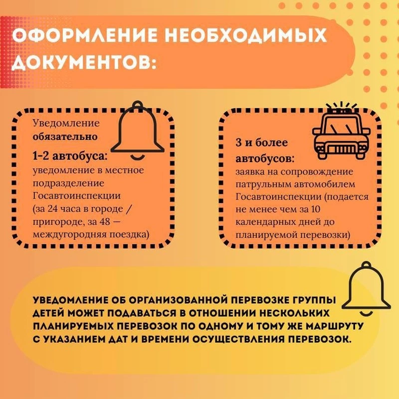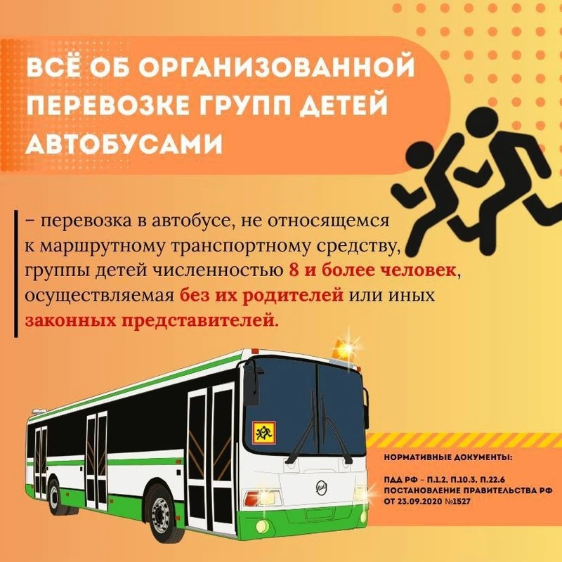 Организованная перевозка детей автобусом проходит по особым правилам. В карточках разбираем, какие документы нужны для оформления такой перевозки, каковы требования к водителю, автобусу и сопровождающим.