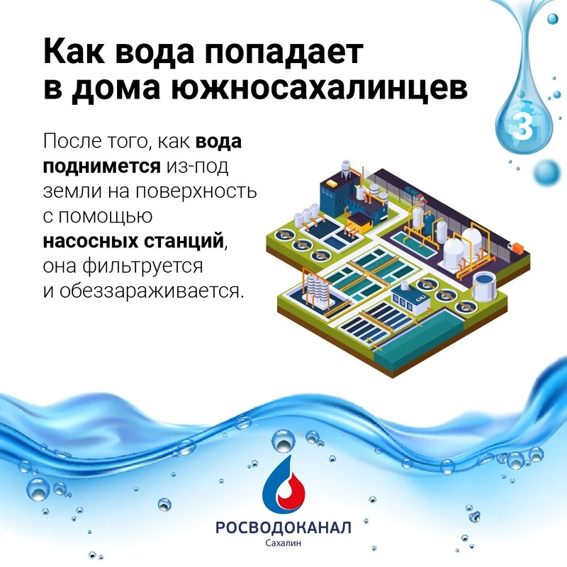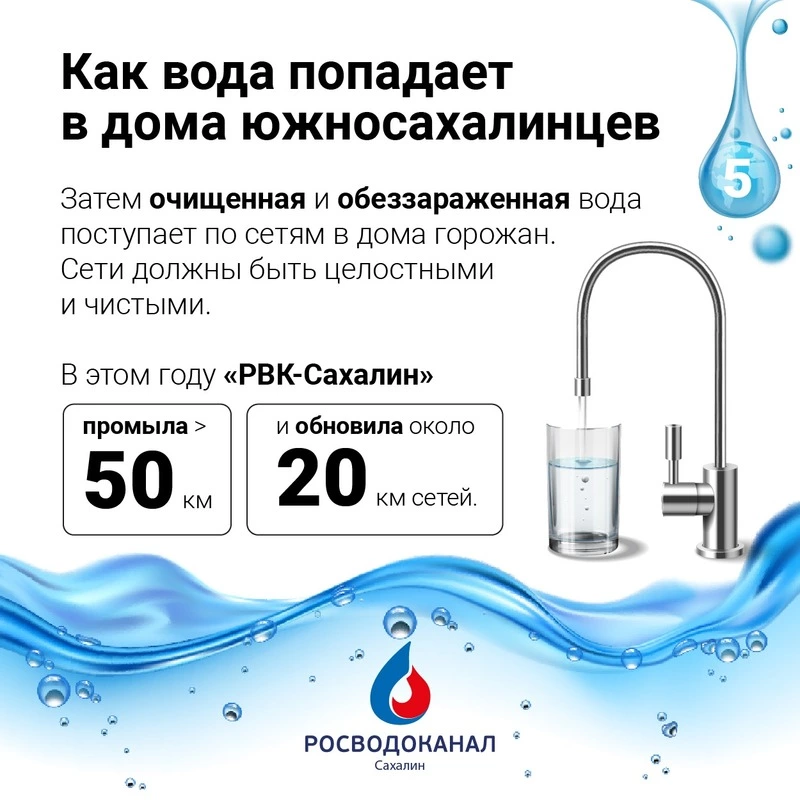 Далее очищенная и обеззараженная вода по сетям водоснабжения подается в город. Очень важно, чтобы по пути качество подготовленной воды не снижалось — к ней не примешивались примеси или осадок, который может скапливаться на внутренней поверхности водопроводных труб. Для того чтобы поддерживать сети в нормативном состоянии, компания обеспечивает их регулярную промывку. А ветхие и аварийные сети меняет на новые и современные. Так, в этом году «РВК-Сахалин» уже промыла более 50 километров сетей и заменила около 20 километров новых коммуникаций