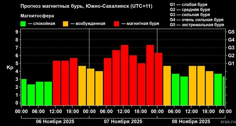 На Земле около 8 часов утра по сахалинскому времени ученые зарегистрировали магнитные бури планетарного масштаба. Сейчас их геомагнитный индекс Kp находится в диапазоне от G2 до G3, то есть от средних до сильных бурь, но уже завтра специалисты обещают индекс свыше G4.