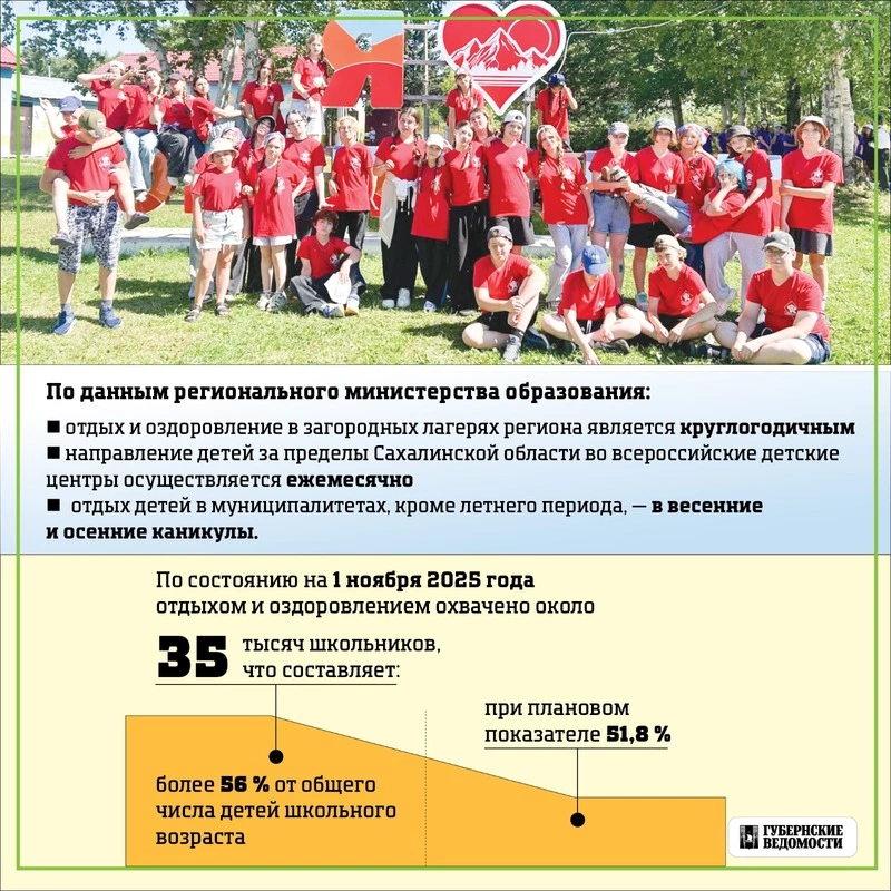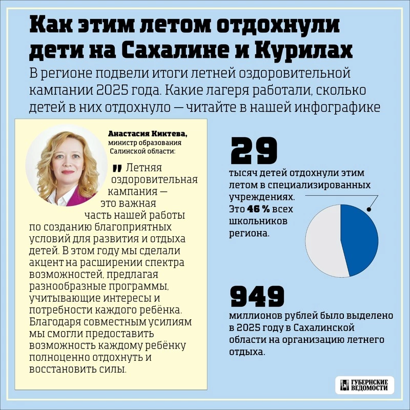 На Сахалине и Курилах подвели итоги летней оздоровительной кампании 2025 года: сколько ребят отдохнули в лагерях и где именно проходили смены — смотрите в нашей инфографике