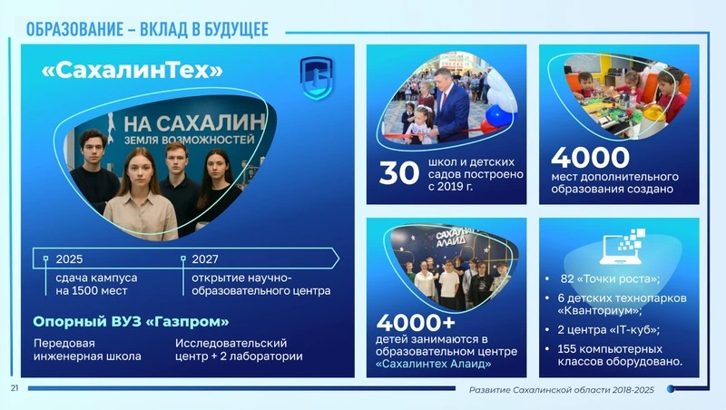 В сфере высшего образования происходят значительные изменения. В Южно-Сахалинске при поддержке президента возводится кампус мирового уровня СахалинТех. Уже заселяется современный студенческий городок, рассчитанный на 1,5 тысячи человек. Завершить строительство научно-образовательного центра планируют к 2027 году. Университет будет готовить специалистов по заказу ведущих компаний региона.