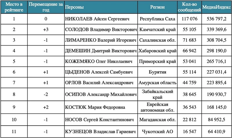 По данным исследования, Валерий Лимаренко вошел в число самых медийных губернаторов ДФО благодаря активной управленческой повестке и регулярному присутствию в информационном поле. Он оперативно реагировал на экстренные ситуации, координировал действия властей и подводил итоги социально-экономического развития региона.