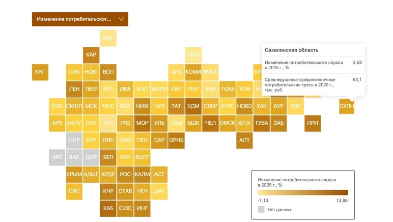 По данным РИА Новости, в России спрос вырос на 2,93%. Это почти в два раза меньше, чем в 2024 году. Эксперты оценивали потребительский спрос, суммируя оборот розничной торговли, объем платных услуг населению и оборот общественного питания. Так, потребительский спрос среди сахалинцев и курильчан вырос на 3,7%. В среднем островитяне тратили более 63 тысяч рублей в месяц. По динамике спроса регион оказался на 32-й позиции.