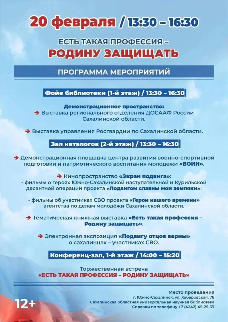 20 февраля 2026 года в Южно-Сахалинске состоится тематический вечер «Есть такая профессия — Родину защищать!», посвященный Дню защитника Отечества. Встречу проведет региональное отделение Всероссийской организации ветеранов в рамках программы «Патриотическое воспитание в Сахалинской области».