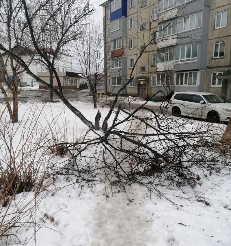 В понедельник, 23 февраля, в одном из районов Южно-Сахалинска сломались и упали два дерева. Причиной этому послужила непогода, в частности ветер со скоростью до 20 метров в секунду. Как сообщили очевидцы происшествия, деревья не задели местных жителей.