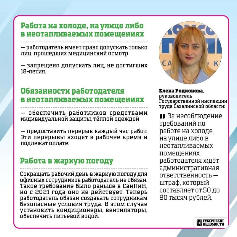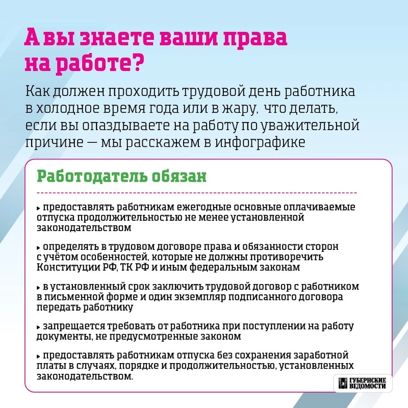 Как организован рабочий день в мороз или жару, и что делать, если вы задерживаетесь на работу по уважительной причине — об этом расскажет наша инфографика.