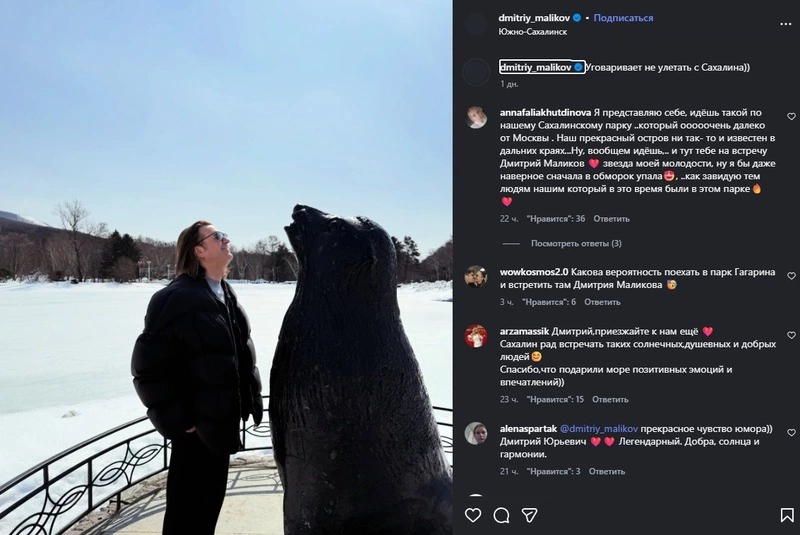 Народный артист России Дмитрий Маликов поделился восторженными впечатлениями от своего первого визита на Сахалин. Певец выступил в Южно-Сахалинске 26 марта на сцене КЗ «Сити Холл». Несмотря на задержку авиарейса и бессонную ночь, артист отметил, что островная земля встретила его невероятно тепло и вдохновляюще.