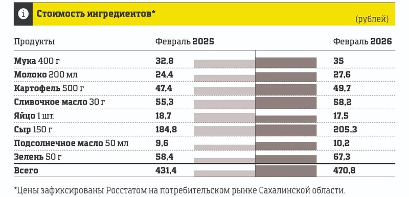 Стоимость продуктов для приготовления ленивых пирожков с картофелем за последние 12 месяцев увеличилась на 9,1%. Основной ингредиент, картофель, за год несколько вырос в цене. У сельхозпроизводителей выросли затраты на семенной материал, топливо, электроэнергию, а также на оплату труда из-за дефицита кадров. В разной степени подорожали другие ингредиенты, в том числе из-за роста затрат на транспортировку. А вот яйца стоили дешевле, чем в феврале 2025 года, благодаря увеличению местного производства.